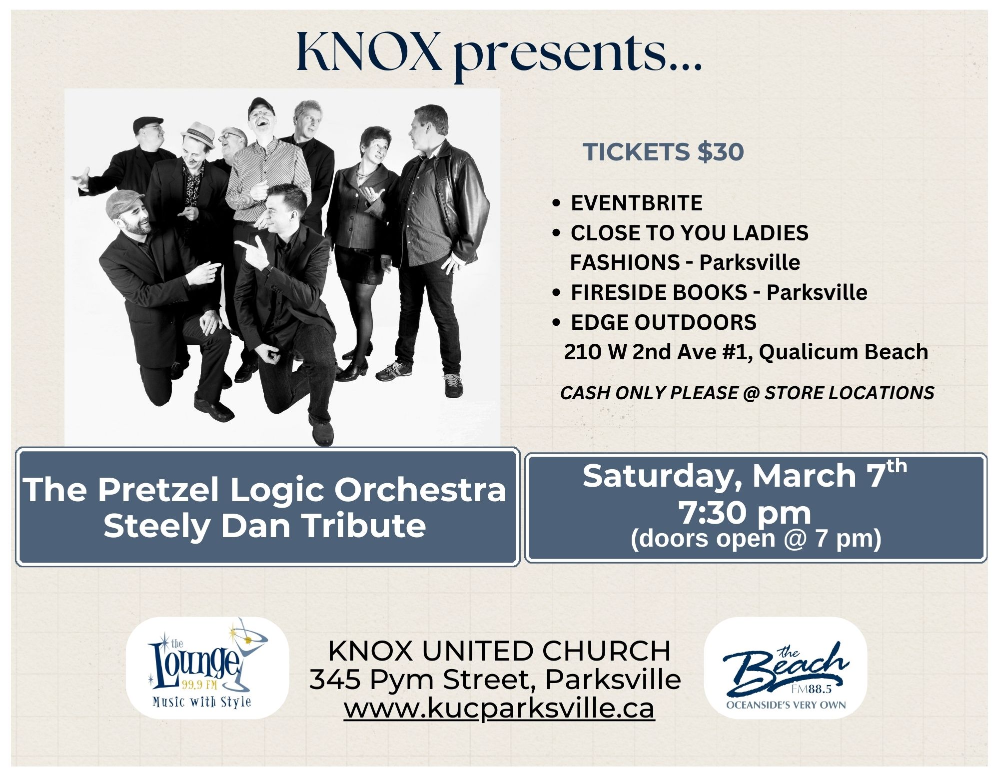 Knox presents...The Pretzel Logic Orchestra, Steely Dan Tribute. Get ready to groove to the smooth sounds of Steely Dan at Knox with The Pretzel Logic Orchestra - a tribute you won't want to miss! Saturday, March 7th @7:30 p.m., doors open at 7:00 p.m. Tickets are $30.00 each and available online through Eventbrite https://www.eventbrite.ca/e/knox-presentsthe-pretzel-logic-orchestra-steely-dan-tribute-tickets-1980653779773?aff=oddtdtcreator or at local retailers Fireside Books & Close To You Boutique in Parksville and Edge Outdoors in Qualicum Beach.